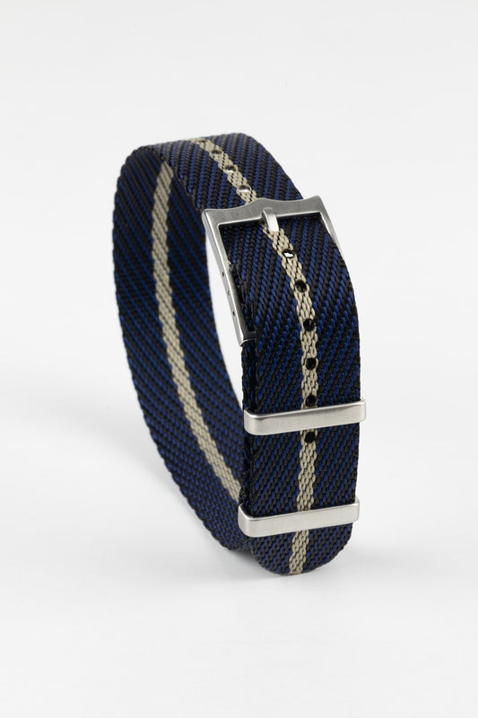 Tudor Style - Woven Nylon Single Pass Strap - Black, Blue & Khaki Stripe