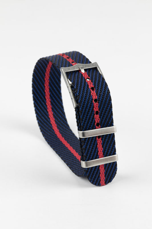Tudor Style - Woven Nylon Single Pass Strap - Black, Blue & Red Stripe