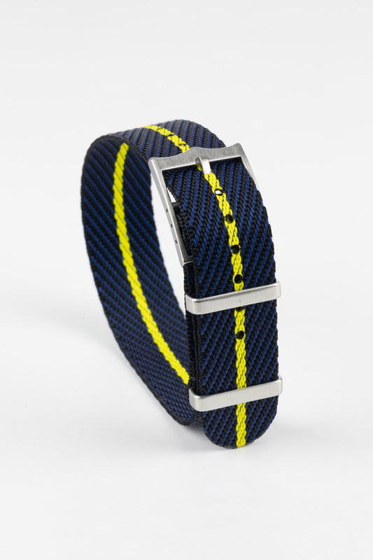 Tudor Style - Woven Nylon Single Pass Strap - Black, Blue & Yellow Stripe