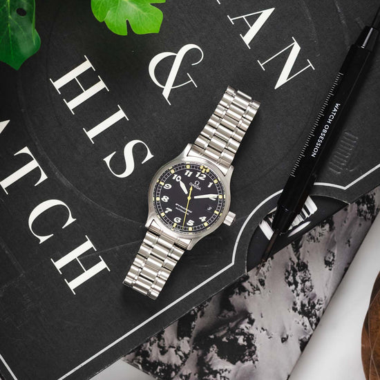 The Omega Dynamic 5200.50.00 is a model from the third generation of the Omega Dynamic line, introduced around 1995. It was designed with a military-inspired aesthetic, referencing watches supplied to the British forces in World War II, and features a 36mm stainless steel case with a date function at 3 o'clock. This three-hand automatic watch is powered by the Omega caliber 1108 movement.